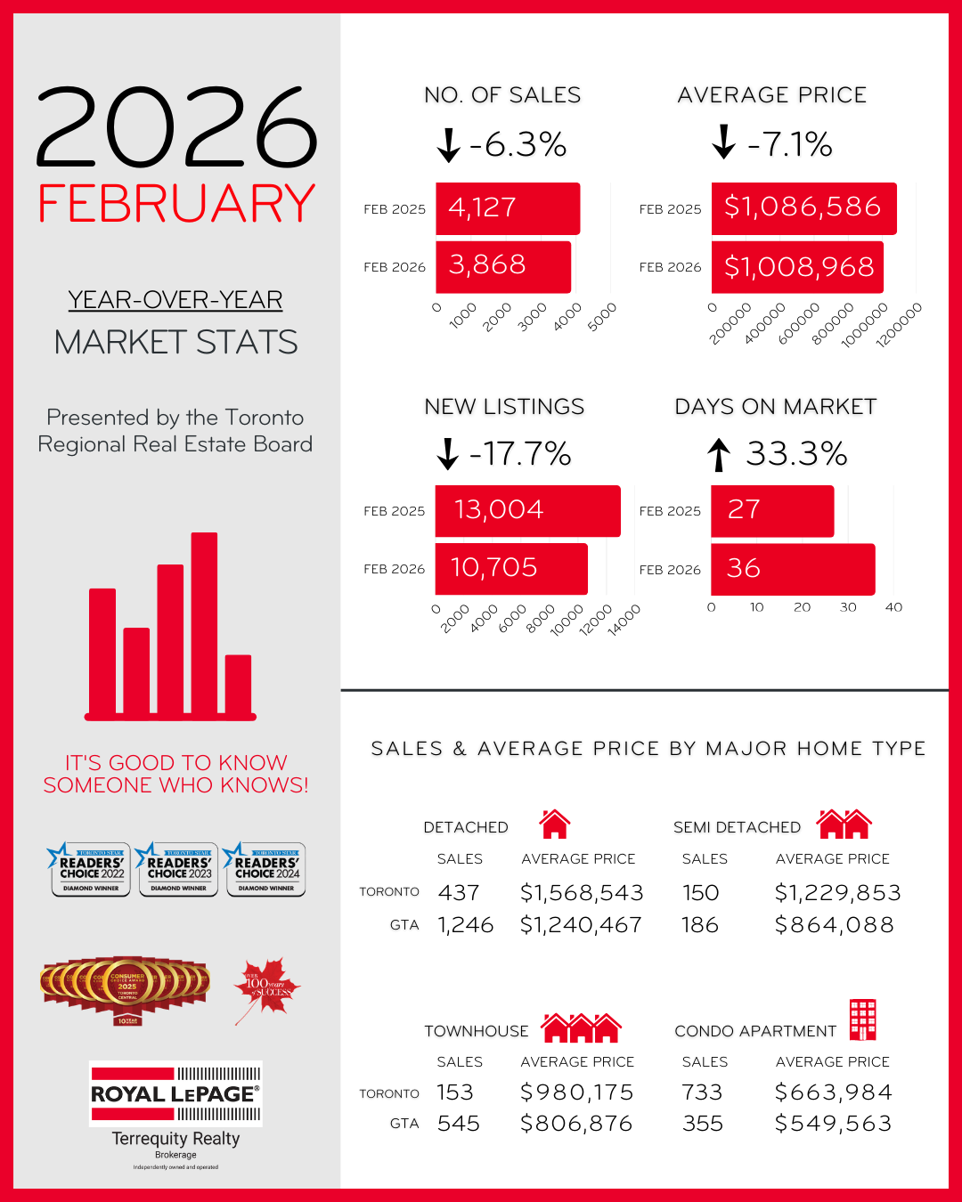 A total of 3,868 homes were sold across the GTA in February, representing a 6.3% decline compared to February 2025. Sales were also slightly lower on a month-to-month basis, falling 1% from January after seasonal adjustments. This slowdown reflects cautious buyer behaviour as many people take a wait-and-see approach to the market.The average selling price across the GTA dropped to $1,008,968, which is 7.1% lower than February of last year. While prices remain high historically, this shift signals a softer market compared to the strong demand seen in previous years.