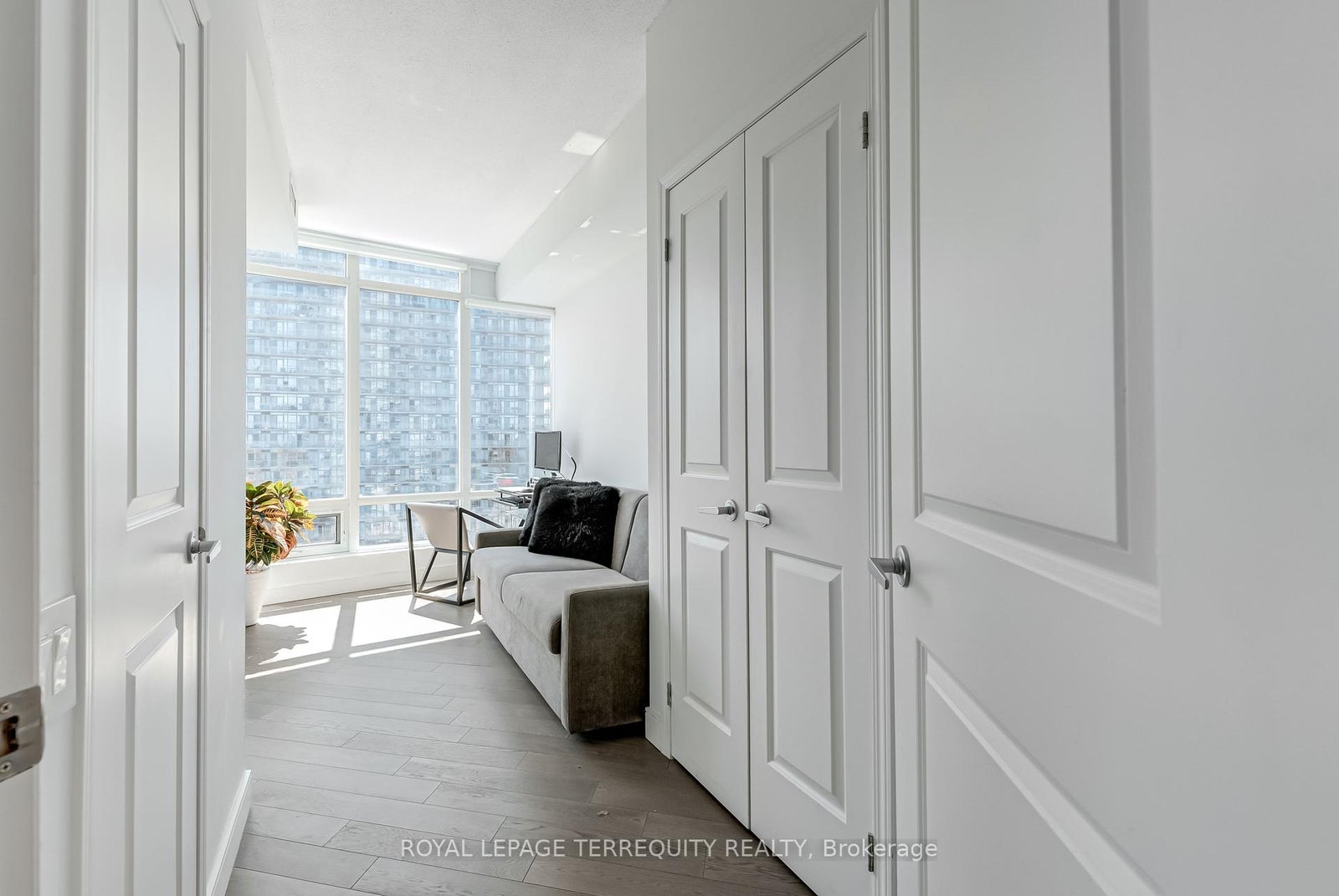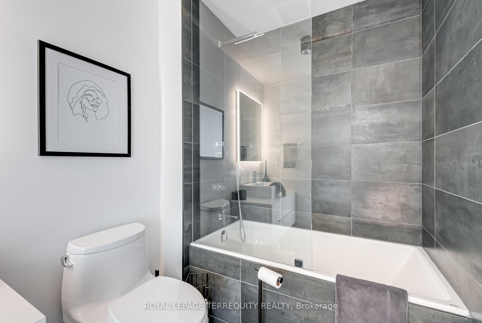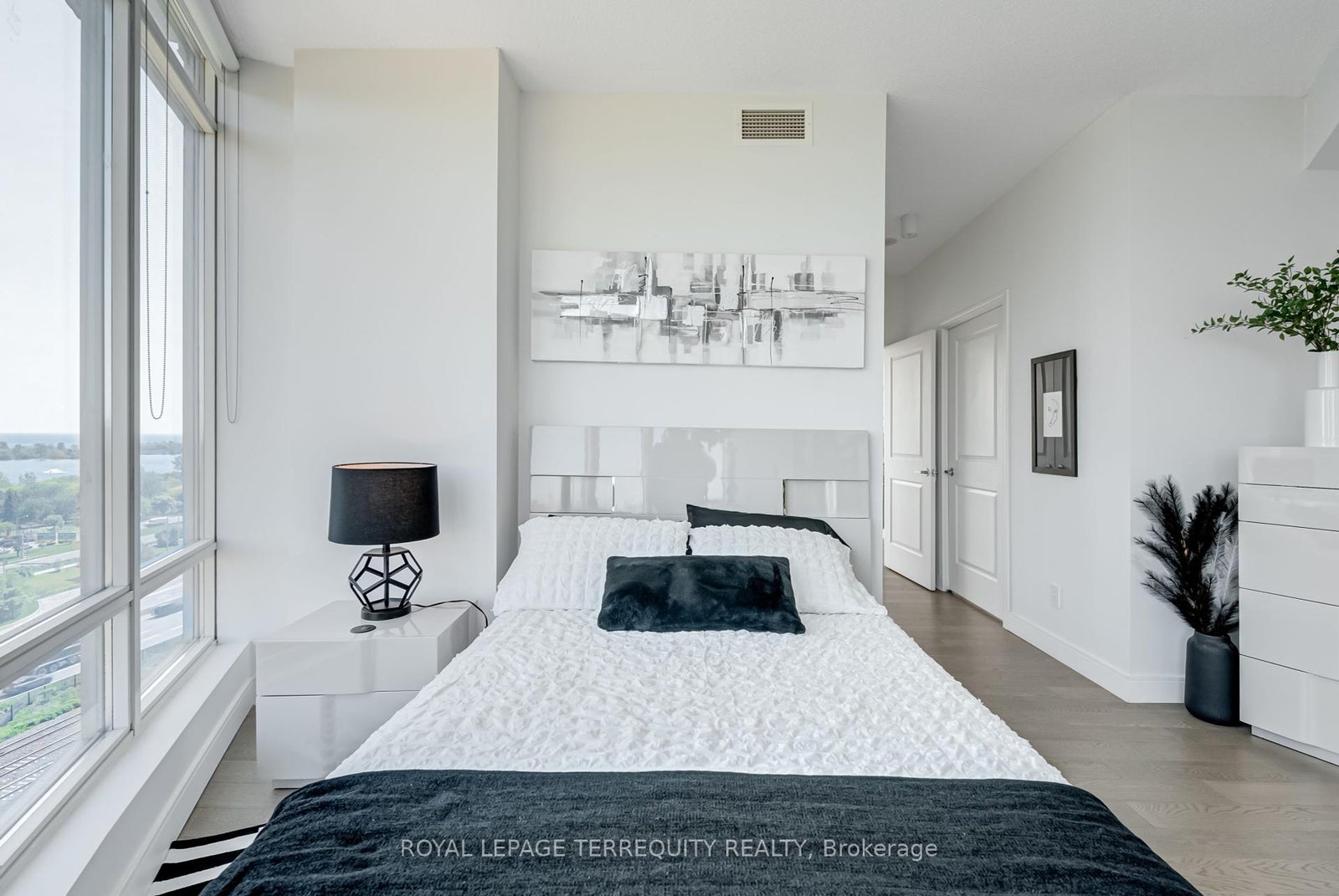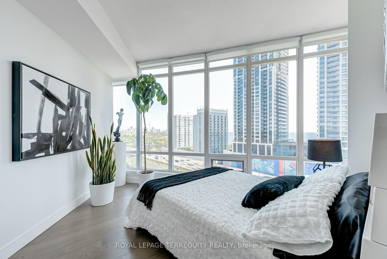 For those who envision life framed by skyline silhouettes and shimmering lake views - this is it! This rarely offered 2+1 bed, 2 bath residence features a functional split-bedroom layout and over $70K in luxury upgrades and finishes. Designed with contemporary flair, every detail has been thoughtfully curated for the discerning buyer who values comfort, design, and elegance. The finest materials, craftsmanship, and finishes elevate this suite to Architectural Digest-worthy status. Enjoy breathtaking 180-degree panoramic views of the city skyline, shoreline, and sunsets through dramatic 9-ft floor-to-ceiling windows. A wall of glass fills the open-concept living and dining area with natural light, creating a warm and expansive atmosphere. Step onto the balcony to unwind and take in golden hour over the lake. A sleek, contemporary kitchen appointed with a quartz waterfall island, countertops, backsplash, and top-of-the-line appliances. The versatile den overlooks the main living space and can function as an office or nursery. The primary bedroom offers a 4-piece ensuite and double closets, while the second bedroom features floor-to-ceiling windows and ample storage. Premium interior upgrades include designer lighting, custom frosted glass panels with backlighting in both bathrooms, custom designed kitchen, upgraded quartz countertops with waterfall edges, and superior hardwood flooring throughout. Nestled in a lush waterfront enclave, this residence offers the perfect blend of serenity and city life. Just minutes from High Park, Sunnyside Beach, Grenadier Pond, and the Lake Ontario boardwalk, nature and leisure await. You're also under 8 minutes to the charm of Bloor West Village with cozy cafes, fine dining, artisan markets, and boutique shopping. With top-rated schools, hospitals, seamless transit, and only 20 minutes to downtown, every urban convenience is easily within reach.