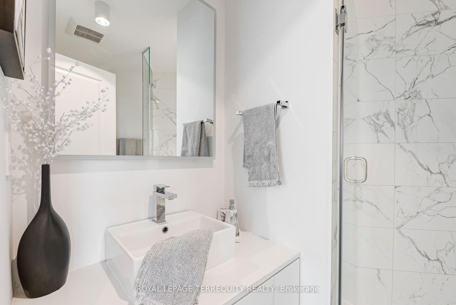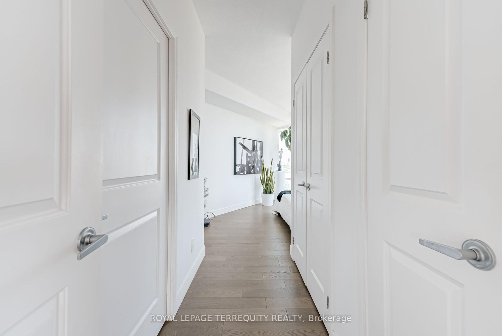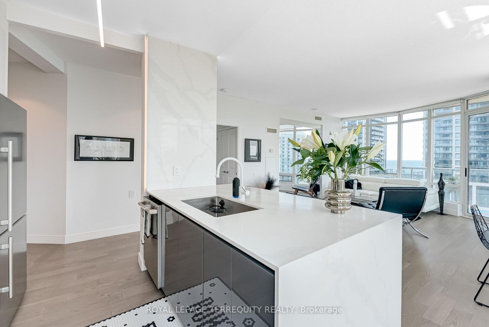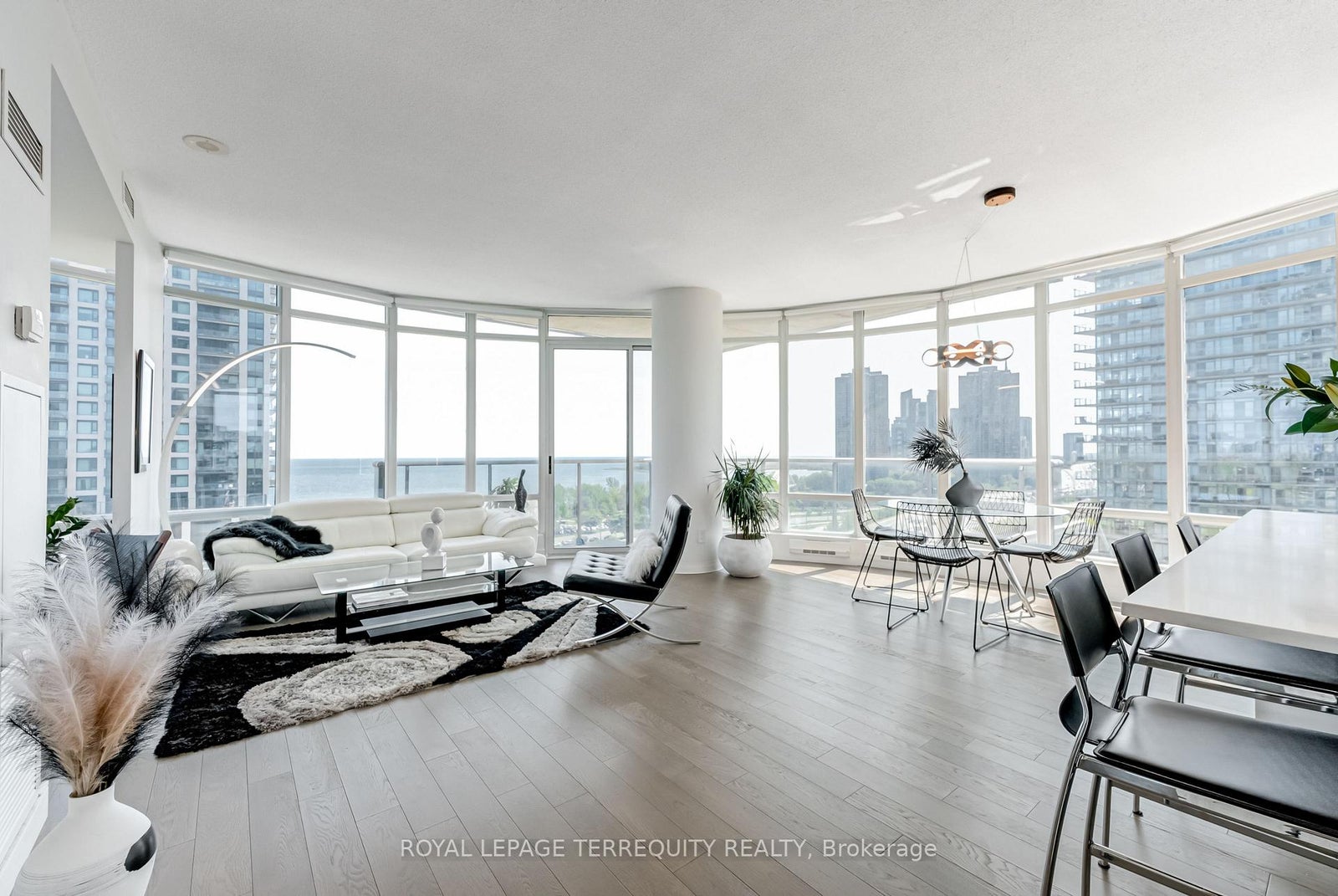 For those who envision life framed by skyline silhouettes and shimmering lake views - this is it! This rarely offered 2+1 bed, 2 bath residence features a functional split-bedroom layout and over $70K in luxury upgrades and finishes. Designed with contemporary flair, every detail has been thoughtfully curated for the discerning buyer who values comfort, design, and elegance. The finest materials, craftsmanship, and finishes elevate this suite to Architectural Digest-worthy status. Enjoy breathtaking 180-degree panoramic views of the city skyline, shoreline, and sunsets through dramatic 9-ft floor-to-ceiling windows. A wall of glass fills the open-concept living and dining area with natural light, creating a warm and expansive atmosphere. Step onto the balcony to unwind and take in golden hour over the lake. A sleek, contemporary kitchen appointed with a quartz waterfall island, countertops, backsplash, and top-of-the-line appliances. The versatile den overlooks the main living space and can function as an office or nursery. The primary bedroom offers a 4-piece ensuite and double closets, while the second bedroom features floor-to-ceiling windows and ample storage. Premium interior upgrades include designer lighting, custom frosted glass panels with backlighting in both bathrooms, custom designed kitchen, upgraded quartz countertops with waterfall edges, and superior hardwood flooring throughout. Nestled in a lush waterfront enclave, this residence offers the perfect blend of serenity and city life. Just minutes from High Park, Sunnyside Beach, Grenadier Pond, and the Lake Ontario boardwalk, nature and leisure await. You're also under 8 minutes to the charm of Bloor West Village with cozy cafes, fine dining, artisan markets, and boutique shopping. With top-rated schools, hospitals, seamless transit, and only 20 minutes to downtown, every urban convenience is easily within reach.
