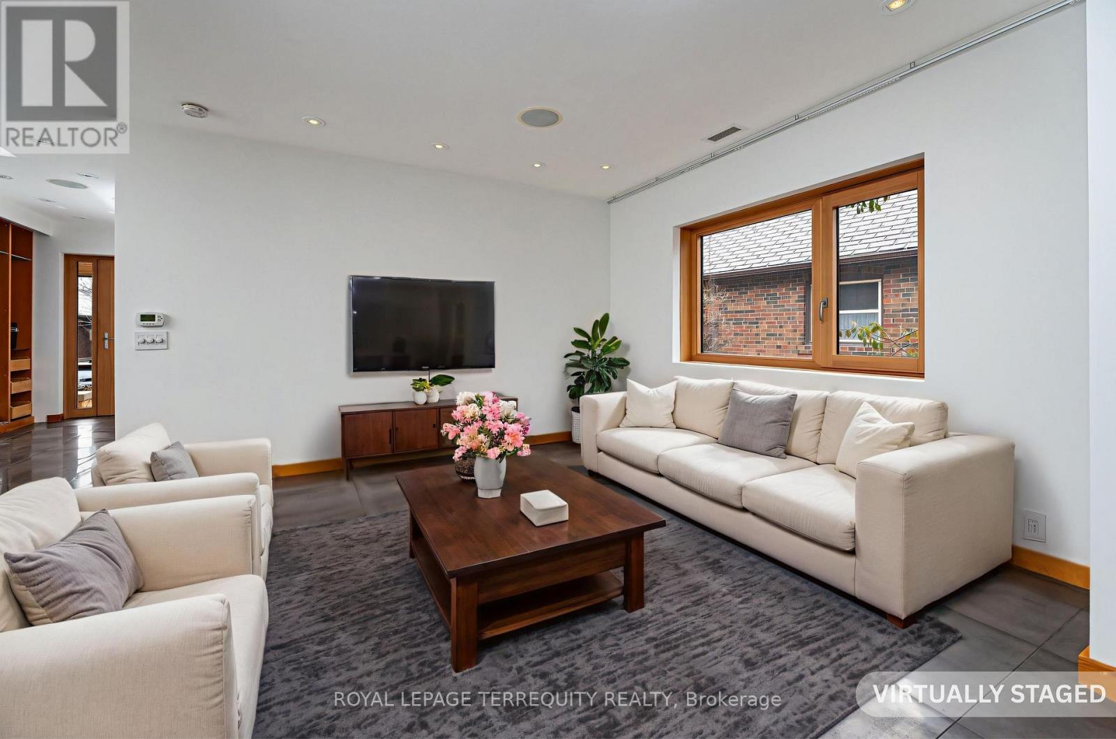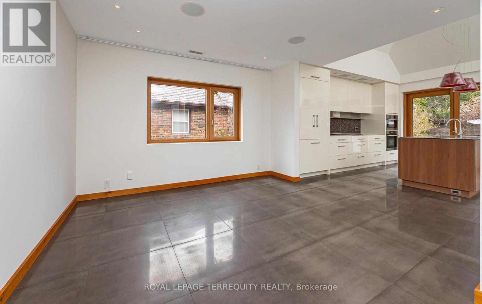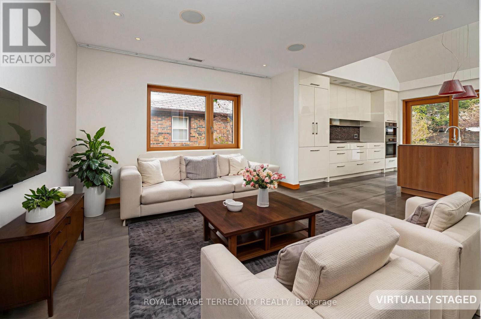 Architect-designed and thoughtfully modernized, this exceptional home seamlessly blends function, space, and natural light with the highest quality finishes throughout. A welcoming front porch leads into a striking interior featuring polished concrete floors with in-floor heating across the main level, complemented by warm, comfortable cork flooring on the lower level. German-engineered wood windows and doors, LED pot lighting, and a built-in sound system enhance the home's refined, contemporary feel. The custom kitchen is a true centerpiece, anchored by a massive island-perfect for both everyday living and entertaining. Two beautifully renovated bathrooms offer style and comfort, while a temperature- and humidity-controlled wine cellar adds a touch of luxury. Outdoors, professionally landscaped gardens showcase mature and native trees and plantings, creating a private, serene retreat. Enchanting rain chains add a unique architectural element to the property. A private drive with parking for two cars adds rare convenience. A standout feature is the incredible garage conversion, now a fabulous studio complete with independent heating and cooling-ideal for a home office, creative space, or guest retreat. The main floor primary bedroom offers wall-to-wall closets with custom organizers, a sleek 3- piece bath, and a thoughtfully integrated finished loft providing exceptional additional storage. The second bedroom is privately situated on the lower level and features its own full 3-piece ensuite bath. Perfectly located just minutes to Bloor Street's shops and cafés, the subway, the lake, and top local amenities including Swansea P.S., the Swansea Recreation Centre, and Rennie Park. Situated within an excellent school district and a truly wonderful community. Please Note: The property is virtually staged. (42590879)
